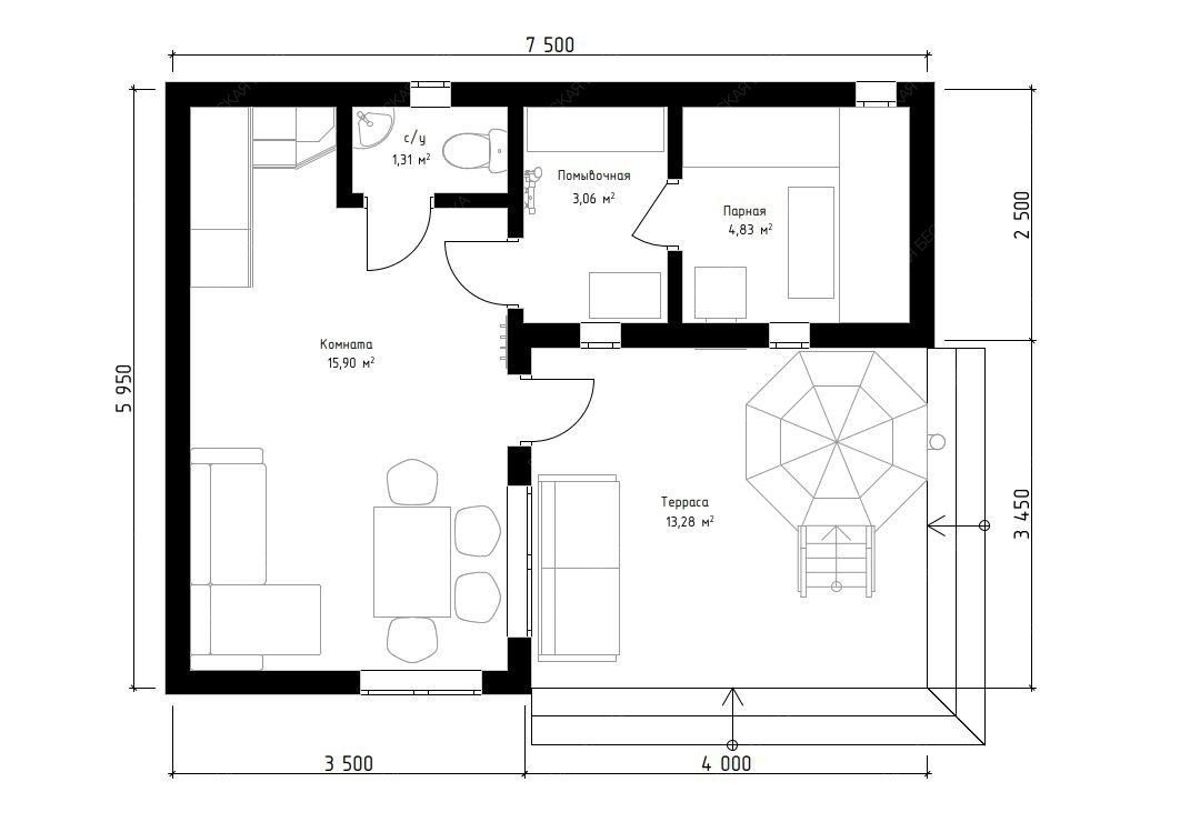 Баня «Монреаль» воплощает концепцию гармоничного пространства, где каждая зона спроектирована для максимального комфорта и расслабления. Обширная открытая терраса площадью 13,28 м² является ключевым элементом архитектуры, плавно продолжая внутреннее пространство и создавая идеальную площадку для отдыха на свежем воздухе, где отлично может расположиться традиционный банный чан для контрастных водных процедур.  Внутренняя планировка отличается продуманной логистикой и комфортом. Просторная комната отдыха (15,9 м²) легко трансформируется в гостиную или столовую, вмещая большую компанию. Функциональная парная (4,83 м²) с деревянным окном-форточкой обеспечивает правильный температурный режим, а отдельная помывочная (3,06 м²) и санузел повышают уровень бытового удобства, делая строение полностью автономным. Односкатная крыша и солидные габариты (5,95х7,5 м) формируют современный, лаконичный экстерьер.  Качественный конструктив из отборной древесины гарантирует долговечность и отличные теплосберегающие свойства. Этот проект предлагает не просто баню, а целый гостевой павильон с акцентом на размеренный отдых и общение, где детали работают на создание завершенной атмосферы загородного релакса.