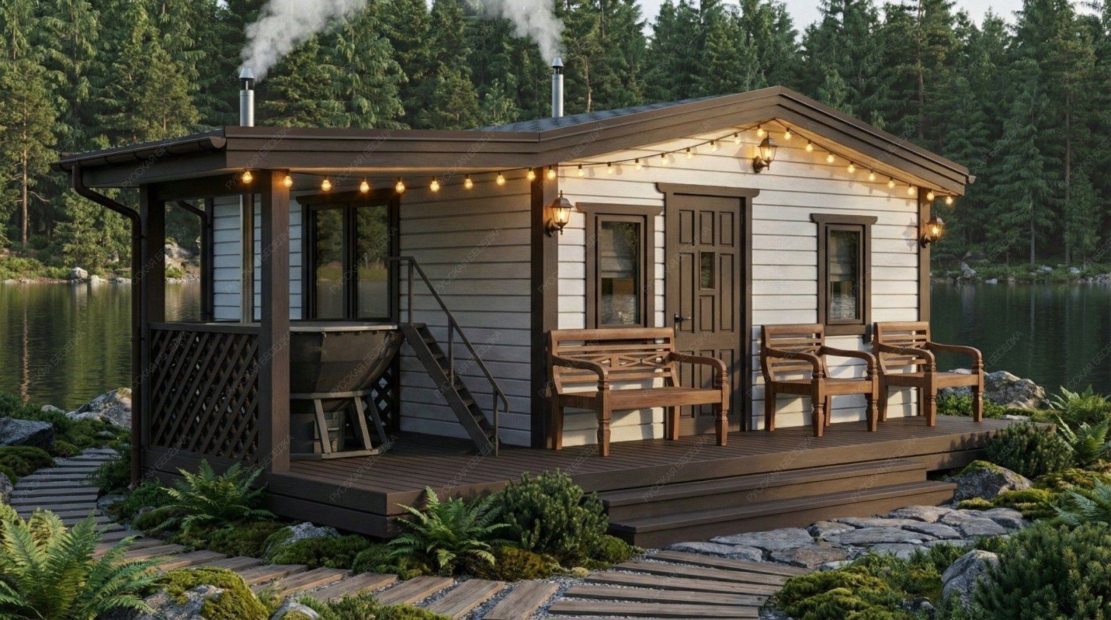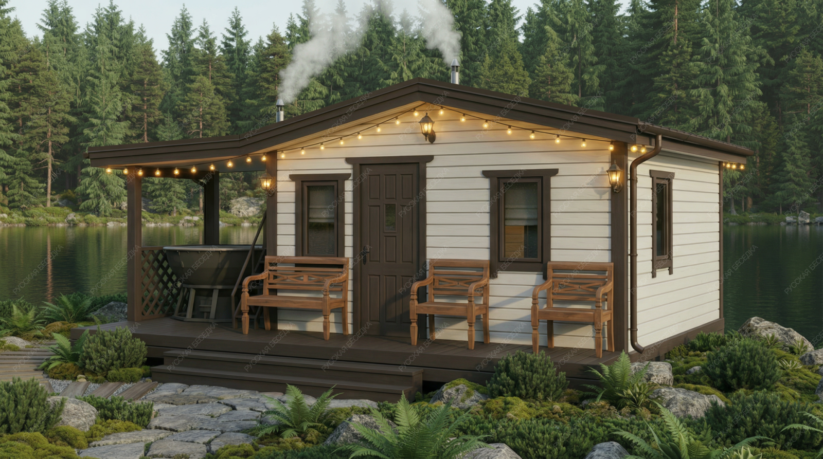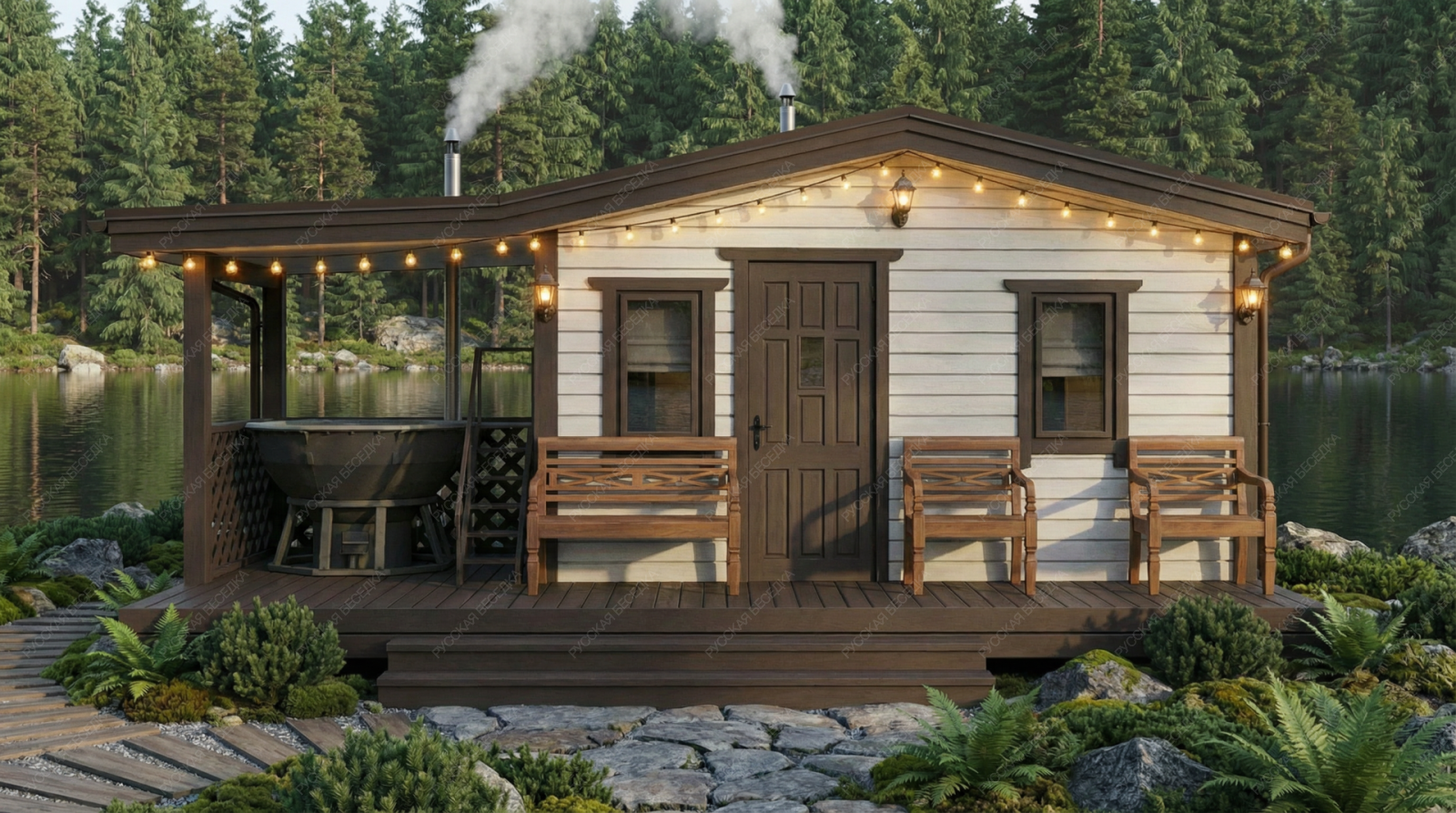 Огнебиозащита (бесцветная) или декоративный деревозащитный состав "Здоровый дом" (цвет на выбор) – нижняя обвязка, лаги, пол и цокольная доска.