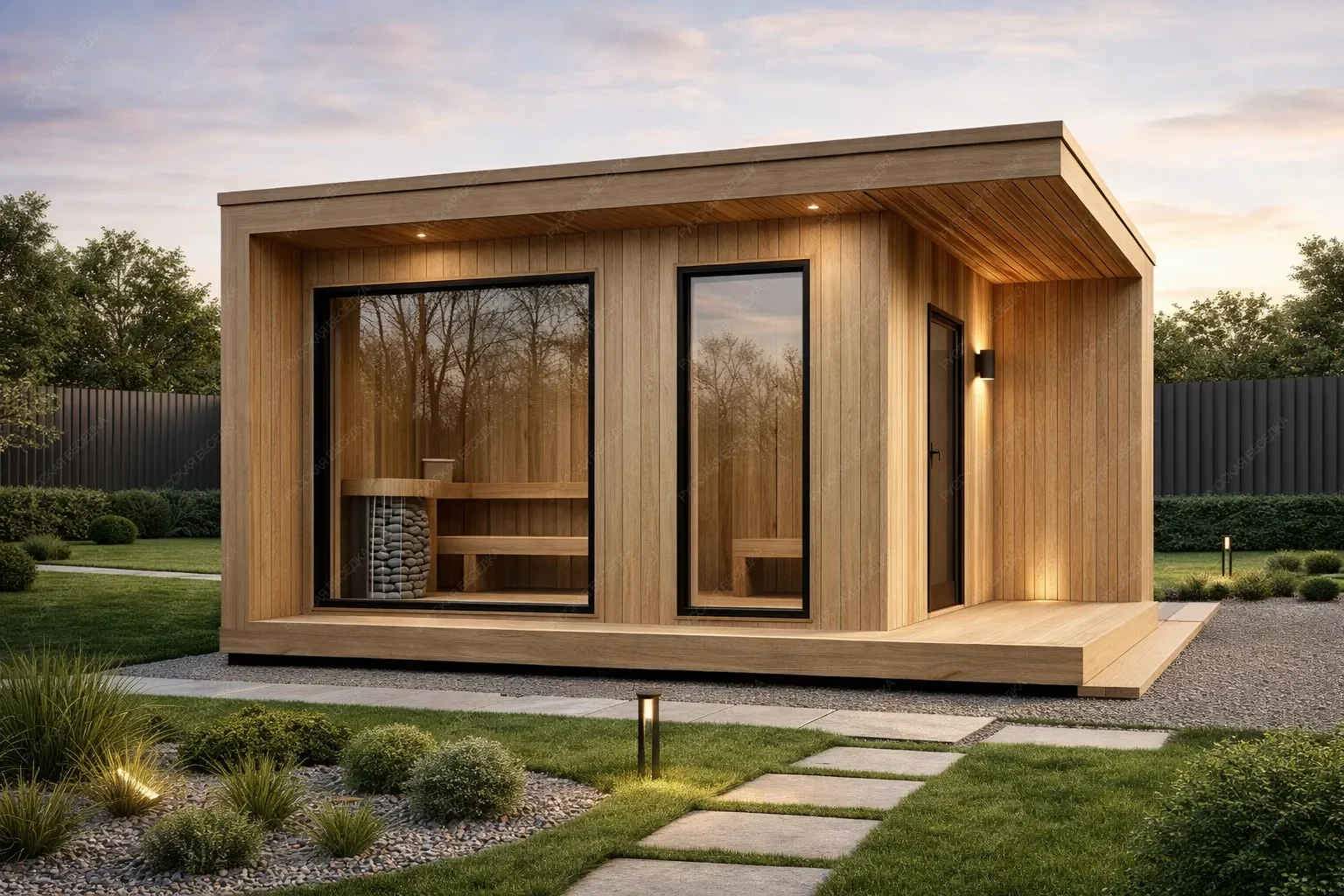 Баня «Зара» представляет собой мобильное и компактное решение габаритами 4х4 метра с односкатной крышей. Общая площадь строения составляет 16 кв.м., рационально разделенных на два функциональных помещения: небольшую, но удобную раздевалку и основную парную. Ключевым элементом, формирующим атмосферу, является панорамное окно в парной, обеспечивающее визуальный контакт с окружающей природой и наполняющее пространство естественным светом. Односкатная кровля придает конструкции современный и динамичный внешний вид. Продуманная планировка создает четкое зонирование, где раздевалка служит практичным буфером, сохраняя тепло и чистоту в парной. Мобильность сооружения позволяет быстро установить его на любом подготовленном участке, не прибегая к капитальному фундаменту. Данная модель оптимальна для организации личного спа-пространства, сочетающего в себе функциональность, эстетику минимализма и открытость ландшафту.