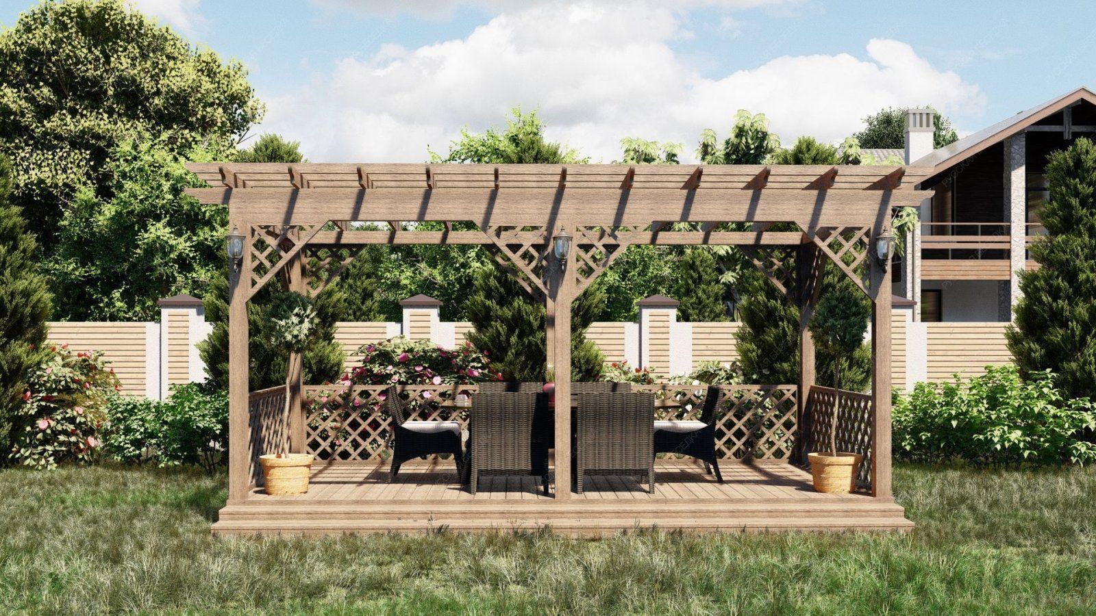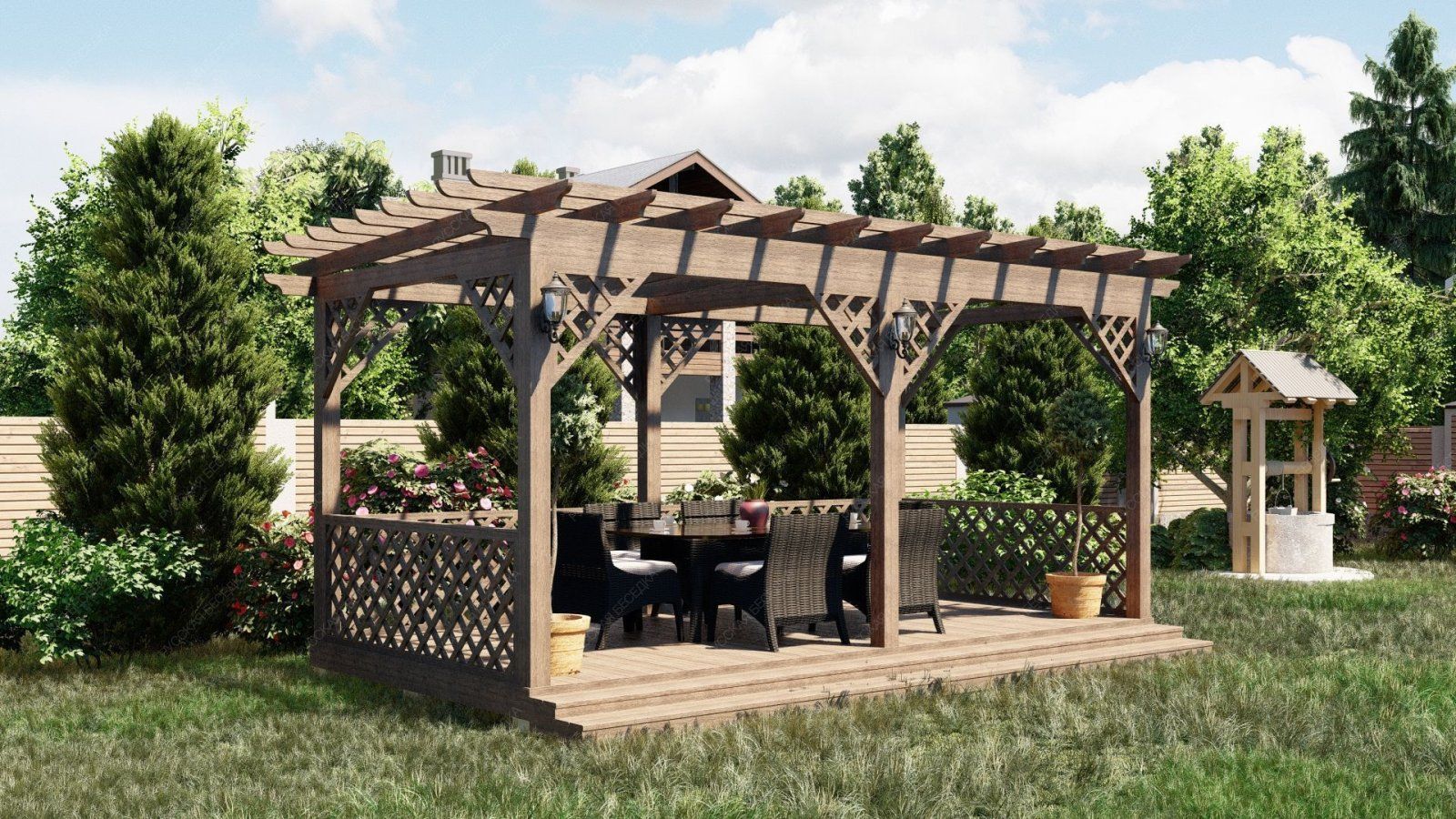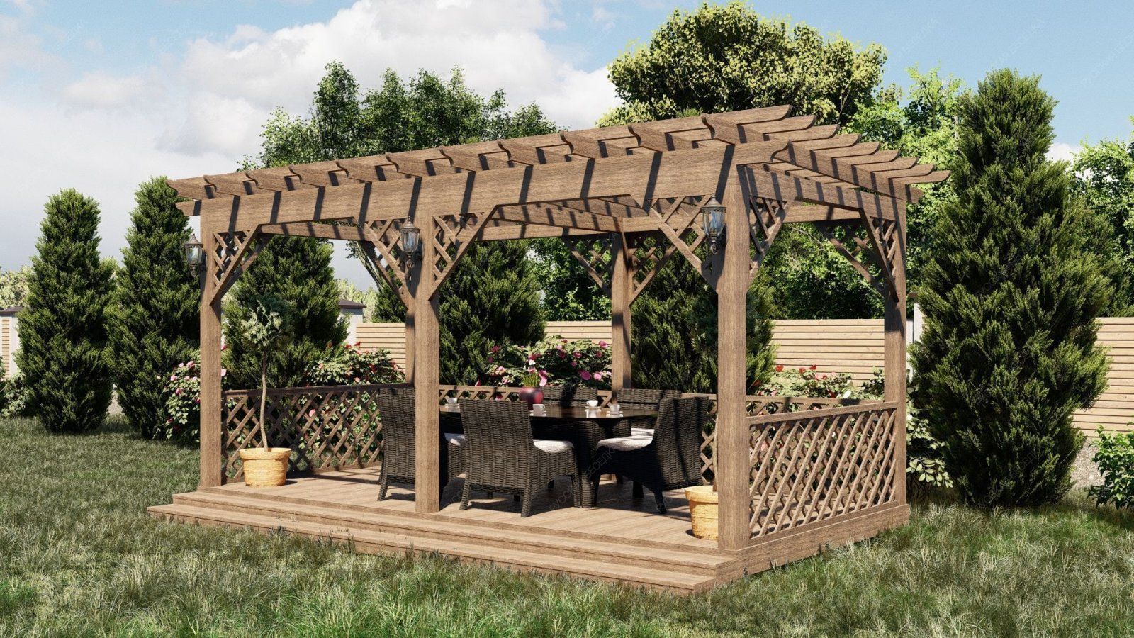Деревянная пергола придаст вашему садовому участку теплую и уютную атмосферу.Также пергола может служить опорой для плетущихся растений - только представьте, как приятно находиться в окружении цветущего клематиса или пышных роз! Дополнительные элементы, такие как встроенное освещение, декоративные решетки, качели или скамейки, могут усилить визуальный эффект и создать еще более комфортное пространство. А если в конструкцию перголы добавить подиум, то он может служить местом для расслабления или стать сценой для семейных мероприятий.
